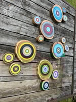 Acrylic on Elm wood cookies sealed with gloss water based polyurethane.